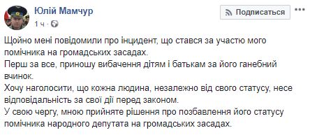 "Только что мне сообщили об инциденте, который произошел с участием моего помощника на общественных началах. Прежде всего, приношу извинение у детей и родителей за его позорный поступок. Хочу подчеркнуть, что каждый человек, независимо от своего статуса, несет ответственность за свои действия перед законом . В свою очередь, мной принято решение о лишении его статуса помощника народного депутата на общественных началах", - отметил Мамчур.