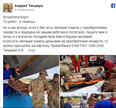 На официальной странице в социальной сети Facebook волонтер Вооруженных сил Украины Андрей Танцюра написал, что накануне в аэропорт Одессы прибыл спецборт из зоны проведения так называемой операции Объединенных сил в Донбассе. По его словам, на борту самолета находились 13 раненых солдат ВСУ, трое из которых тяжелые. Далее он отметил, что силовики пройдут лечение в Военно-медицинском клиническом центре Южного региона (411-м госпитале). Подробности получения солдатами ранений он решил не делиться.
