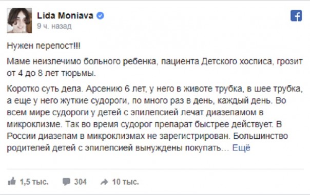 Второе место. В отношении жительницы Москвы Екатерины Конновой завели уголовное дело о сбыте наркотиков после того, как она пыталась перепродать оставшиеся после лечения сына микроклизмы с диазепамом. Узнав о том, что мать решила продать лекарства, применяемые для профилактики эпилептических припадков, которые, к слову, в России почему-то забыли сертифицировать, местные правоохранители провели целую спецоперацию. Все сделали правильно. Оперативник выступил в качестве потенциального покупателя и женщину задержали именно в момент передачи «товара». Теперь сотрудники полиции рассказывают о контрабандном ввозе в страну жизненно необходимых ребенку препаратов, попутно вменяя матери сбыт «наркотических веществ», что может обернуться для женщины реальным заключением на срок от 4 до 8 лет. Молодцы! Четко сработали! Все крупнейшие наркокартели мира бьются в неудержимой панике. Мощнейшая сеть доставки и распространения наркотиков из Европы в Россию ликвидирована при попытке реализовать крупную партию опасных веществ стоимостью 3250 рублей. Трепещите, «барыги»! Пока такие люди стоят на страже нашего спокойствия, наркотики в Россию не прорвутся!