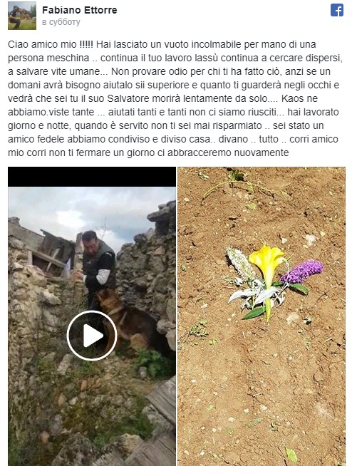 "Ты оставил невосполнимую пустоту из-за того, что сделало какое-то ничтожество. Продолжай работать там наверху, продолжай искать пропавших, спасать жизни … Ты работал день и ночь, когда было нужно, ты никогда не жалел себя, ты стал мне верным другом, с которым мы делили дом и диван. Беги, мой друг, не останавливайся, однажды мы снова обнимемся", — написал Этторре.