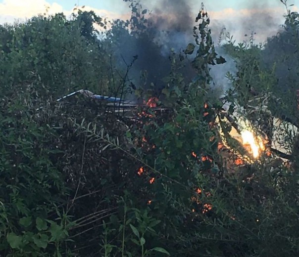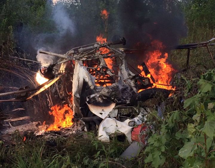 Отмечается, что самолет во время взлета зацепил кабель высоковольтной линии электропередачи и рухнул на землю.