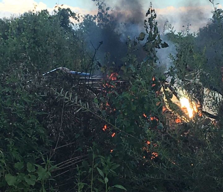 После столкновения с кабелем линии высоковольтного напряжения самолет рухнул на землю и загорелся.
