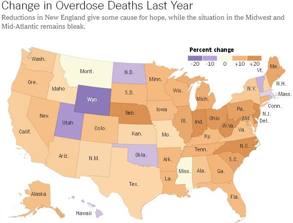 Рост смертности от передозировок неравномерен, в восьми штатах даше произошло снижение (отмечены фиолетовым). Например, в Небраске рост 33%, а в Вайоминге сокращение на 33%.