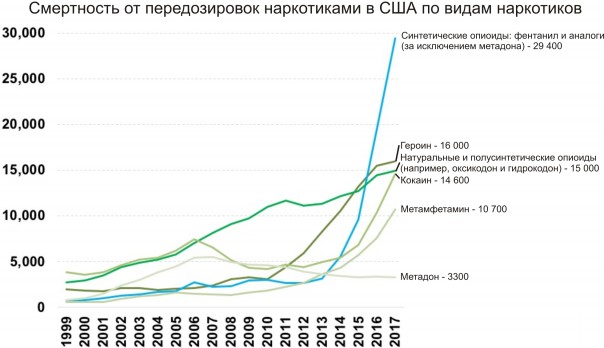 Опять хорошие новости из США. По предварительным официальным данным, в 2017 г. от передозировок наркотиками (включая рецептурные опиоидные обезболивающие) скончались 72,3 тыс. человек, рост за год составил 14%. Ниже восемь картинок.