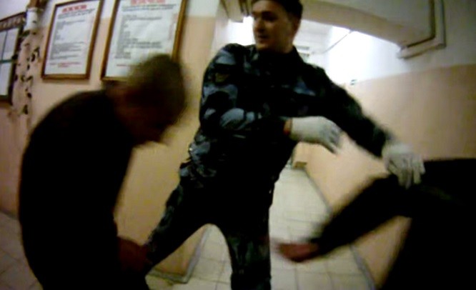 Видно, как сотрудники колонии и люди в масках (предположительно спецназ ФСИН) выстраиваются вдоль стен в коридоре колонии по обе стороны. Сквозь этот строй прогоняют четверых заключенных в черных робах, на их спины и головы обрушиваются удары со всех сторон. Бьют руками, ногами и дубинкам. «Меня уволят когда-нибудь», — весело отзывается один из тюремщиков, сделавший свое дело.