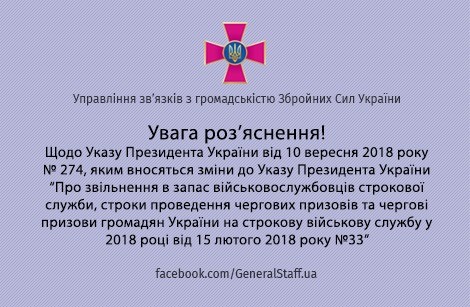 “О внесении изменений в Указ Президента Украины от 15 февраля 2018 года №33 “Об увольнении в запас военнослужащих срочной службы, сроках проведения очередных призывов и очередных призывах граждан Украины на срочную службу в 2018 году” предусматривает продление срока призыва граждан Украины на срочную военную службу до декабря месяца текущего года, что обусловлено прежде всего увеличением численности призывников для комплектования войск (сил) Национальной гвардии Украины и Государственной пограничной службы Украины”, – подчеркнули в Генштабе.
