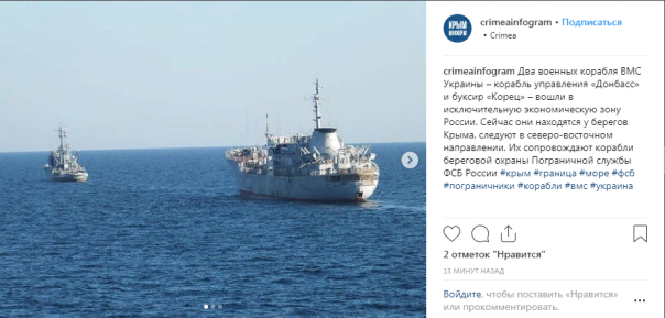 "В настоящее время два корабля Военно-морских сил Украины — корабль управления "Донбасс" и буксир "Корец" — находятся недалеко от берегов Крыма, в исключительной экономической зоне РФ, следуя в северо-восточном направлении", — говорится в сообщении пресс-службы.