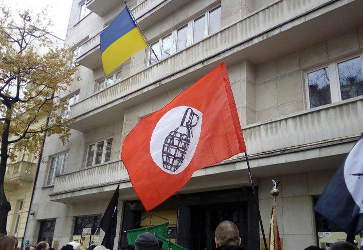 Активисты партии «Другая Россия» Эдуарда Лимонова совместно с польской организацией «Фаланга», приняли участие в митинге перед посольством Украины в Варшаве с требованием раздела территории бывшей советской республики между странами-соседями.