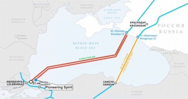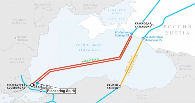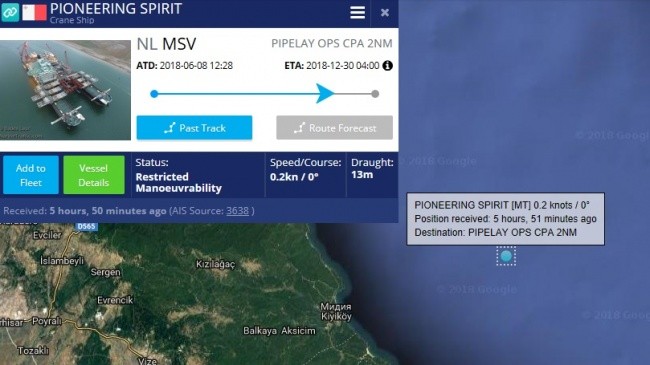 До турецкого берега осталось уложить чуть более двух десятков километров газопровода, чтобы полностью завершить морскую часть «Турецкого потока». По данным навигационного портала Marinetraffic, трубоукладочное судно Pioneering Spirit находится в 21 километре от турецкого населенного пункта Кыйыкей, где «Турецкий поток» выходит на берег.
