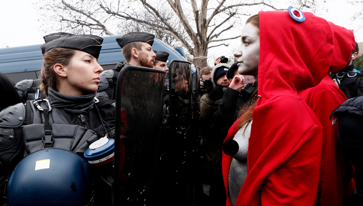 Пять женщин в образе символа Франции Марианны, одетые в красные кофты, провели акцию на Елисейских полях, где проходит пятый этап протестов "желтых жилетов". Участницы акции, лица и грудь которых были выкрашены краской под бронзу, простояли полчаса перед кордоном полиции и удалились.