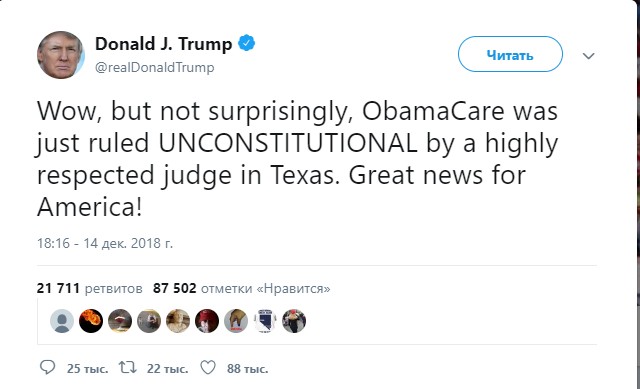 Президент США Дональд Трамп назвал вердикт «отличной новостью для Америки». «Вау, но неудивительно, что «Обамакер» был признан неконституционным», — написал он в Twitter.