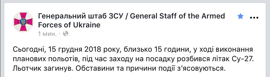 "Сегодня, 15 декабря 2018 года, на Житомирщине, около 15:00 в ходе выполнения плановых полетов при заходе на посадку разбился самолет Су-27. Летчик погиб", – говорится в сообщении Генштаба на странице в Facebook.
