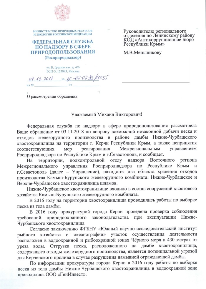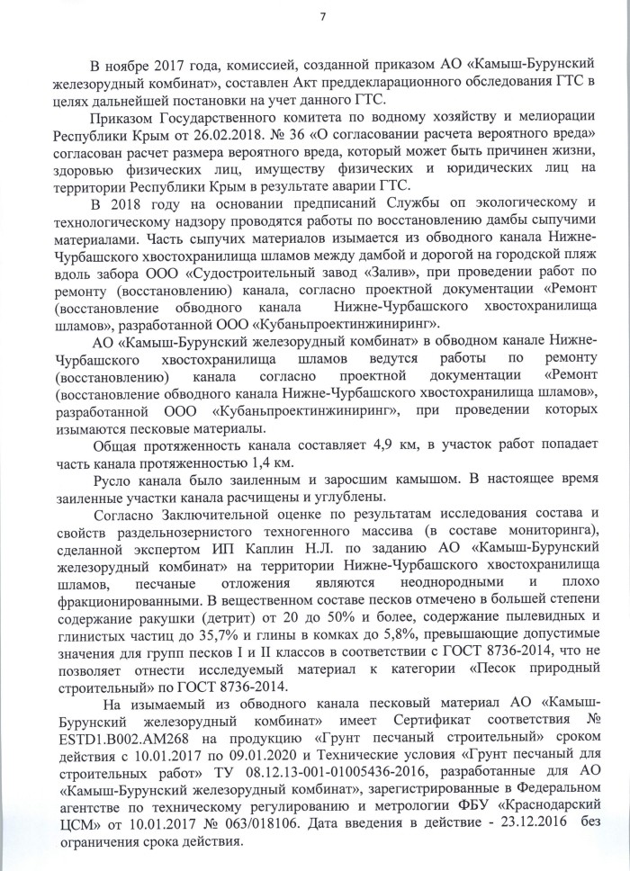 Согласно заключения ФГБНУ «Южный научно-исследовательский институт рыбного хозяйства и океанографии», работы по извлечению песка из дамбы производились в водоохранной и рыбоохранной зонах Азовского моря. Установлено, что отгрузка песка из дамбы хвостохранилища, содержащего отходы железорудного производства, является потенциальной угрозой для Керченского пролива в случае разрушения ограждающей дамбы.
