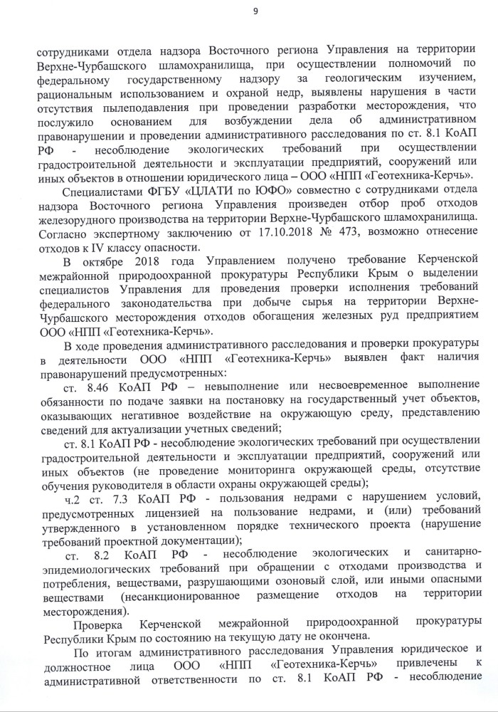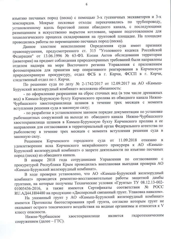 В ходе прокурорских проверок и рейдов Крымского управления Ростехнадзора в 2016 году были установлены следующие обстоятельства: ликвидатор АО «Камыш-Бурунский железорудный комбинат» приступил к выемке песка из тела дамбы Нижне-Чурбашского хвостохранилища, не имея разрешения на вывод ГТС из эксплуатации.