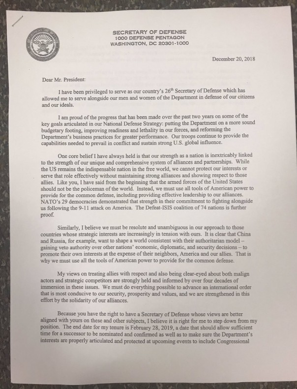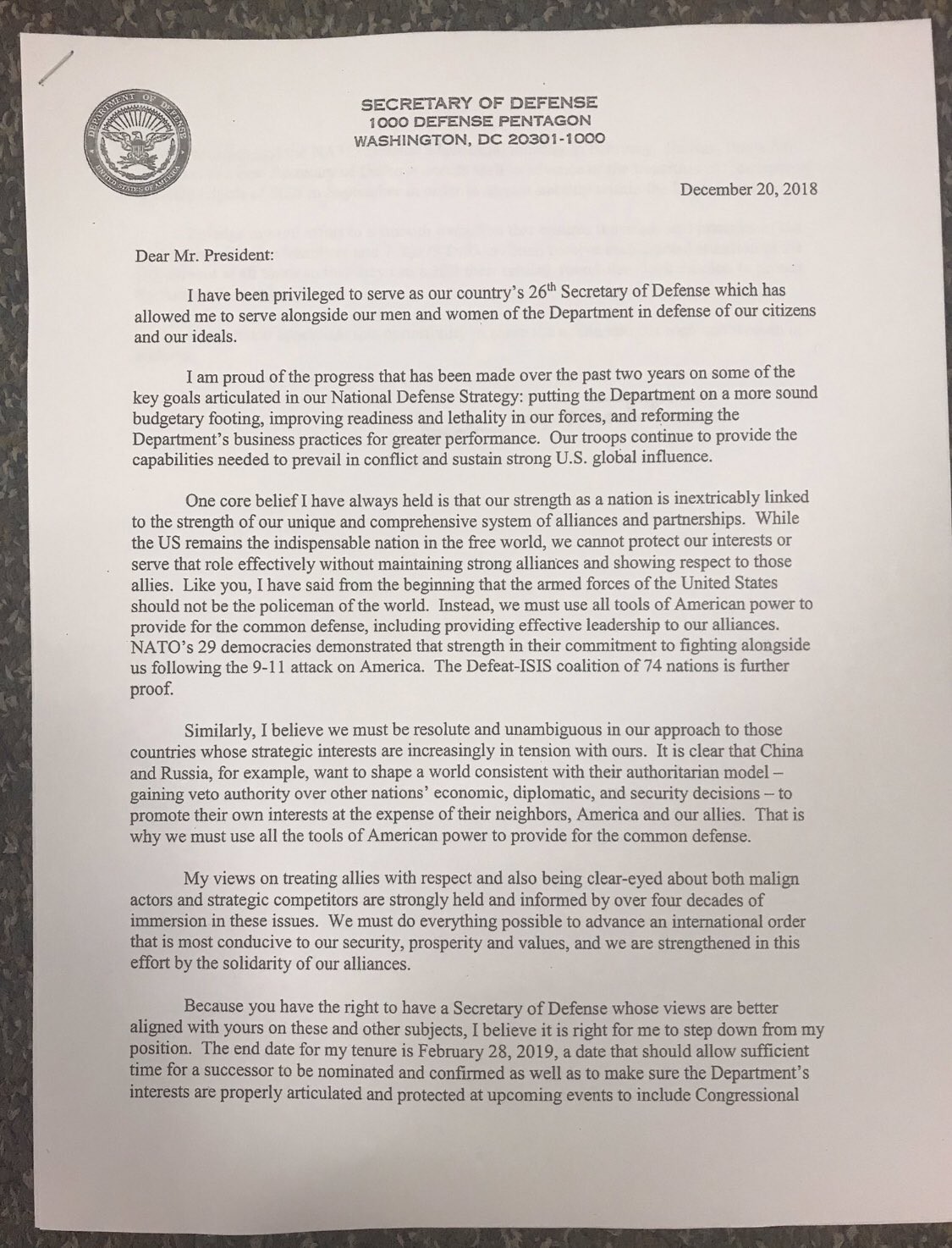 Джеймс Мэттис попросил освободить его от должности в личном письме, которое он адресовал американскому лидеру, сообщает телеканал CNBC. "У вас есть право иметь министра обороны, чьи взгляды больше совпадают с вашими", - говорится в послании. Не исключено, что руководитель американского оборонного ведомства так отреагировал на решение Трампа вывести войска из Сирии.