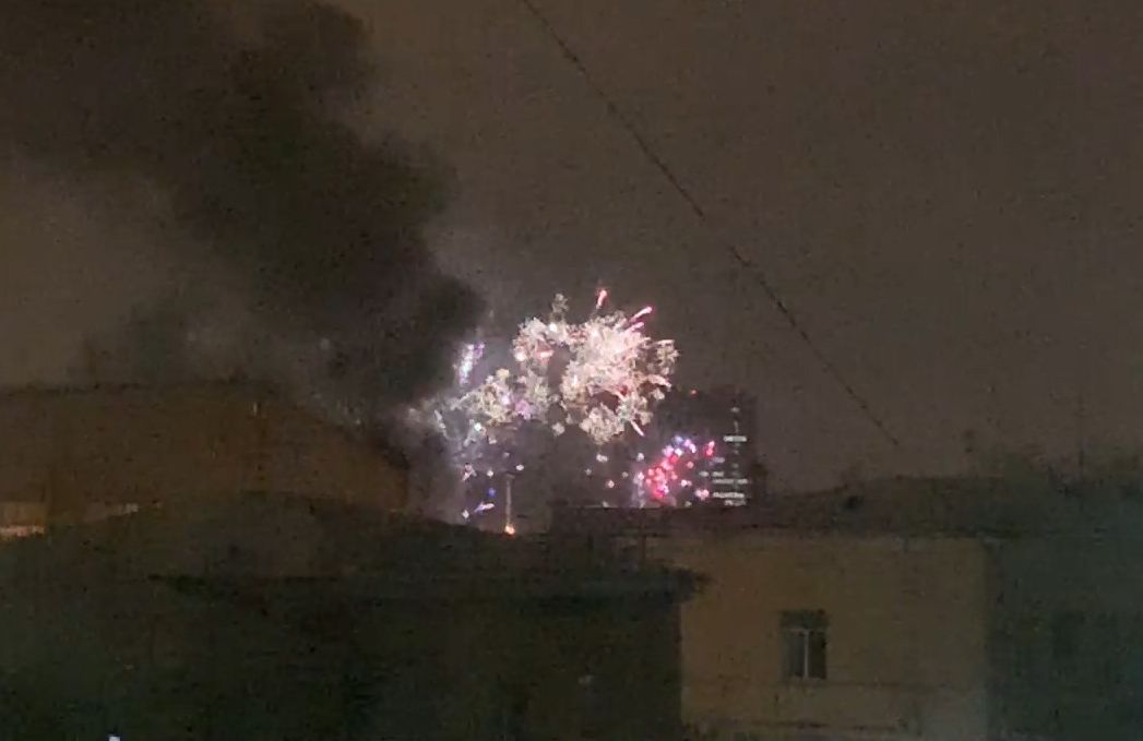 Пожар произошёл на складе с фейерверками в Санкт-Петербурге. Cалюты по-прежнему продолжают взрываться, из здания склада идёт тёмный дым.