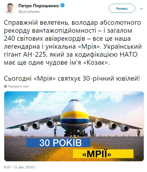Пользователи Сети высмеяли президента Украины Петра Порошенко, который в своем Twitter отметил 30-летний юбилей "украинского гиганта" Ан-225.