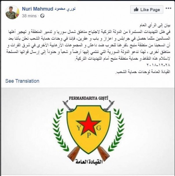 Из-за постоянных угроз Турции на севере Сирии, мы, бойцы YPG - кто боролся против ИГИЛ на восточном Евфрате, просим правительство Сирийской Арабской Республики взять под контроль город Манбидж и прилегающие районы и защитить мирных жителей.