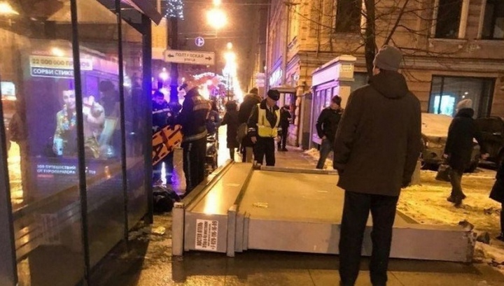 Момент падения рекламного щита на прохожих в Петербурге попал на видео