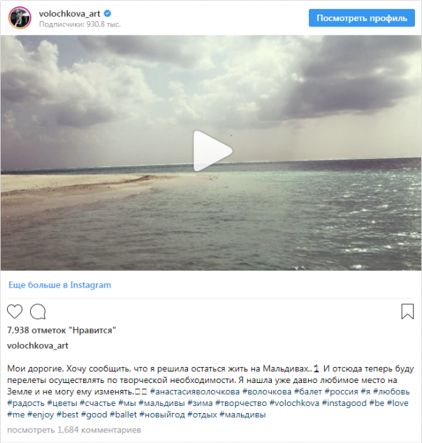 "Хочу сообщить, что я решила остаться жить на Мальдивах. И отсюда теперь буду перелеты осуществлять по творческой необходимости. Я нашла уже давно любимое место на Земле и не могу ему изменять", - написала Волочкова.