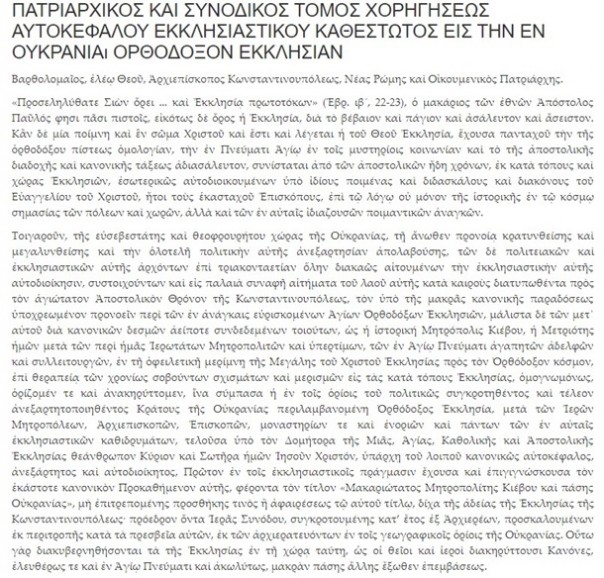 Константинопольский патриарх Варфоломей вручил главе Православной церкви Украины митрополиту Епифанию томос об автокефалии 6 января. На один день документ выставили в Киеве, после чего он был возвращен в Стамбул. 9 января его подписали все члены Синода Константинопольского патриархата, но до сегодняшнего дня пресс-служба Вселенского патриархата отказывалась представить текст томоса, ссылаясь на то, что его перевод на английский язык еще не подготовлен, передает ТАСС.