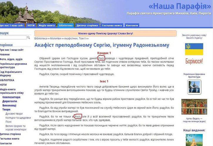 В акафисте святому игумену Сергию Радонежскому, размещенном на сайте киевского прихода созданной из раскольников ПЦУ, звучат слова о России.