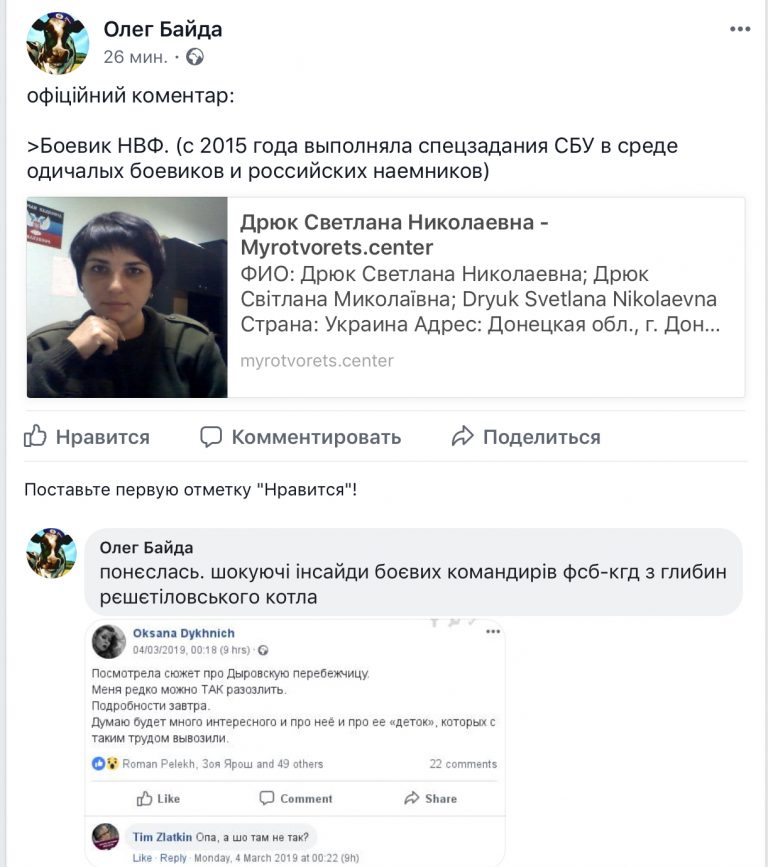 В эфире телеканала «1+1» бывшая ополченка ЛНР Светлана Дрюк сообщила, что ее любовь к украинскому разведчику спутала все карты военному руководству самопровозглашенной республики. ЛНР она покинула с пакетом важных документов. Благодаря ее сведениям украинские подразделения уничтожили восемь танков Т-72.