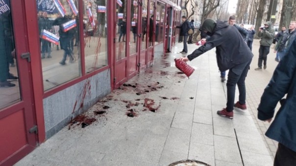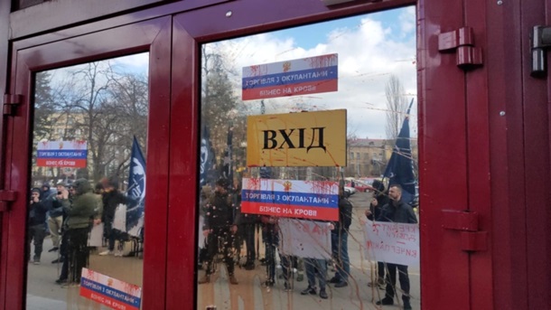 Активисты националистической организации Традиция и порядок во вторник, 12 марта, облили кровью и обклеили стикерами вход в здание Национального антикоррупционного бюро Украины.