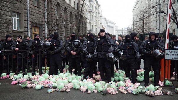 Добравшись до администрации Порошенко, националисты стали забрасывать полицию мягкими игрушками.