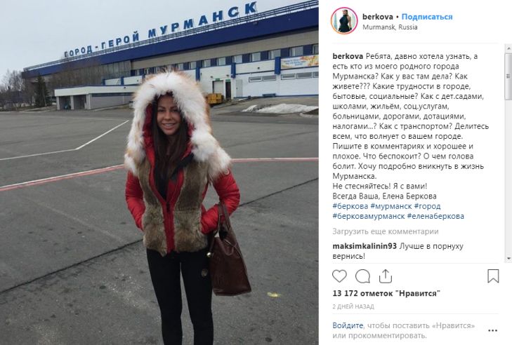 Беркова (родившаяся в Мурманской области) уже обратилась через свой Instagram к жителям малой родины с просьбой рассказать о местных проблемах, поинтересовалась состоянием инфраструктуры: "Как у вас там дела? Как живёте? Какие трудности в городе, бытовые, социальные? Как с дет. садами, школами, жильём, соц. услугами, больницами, дорогами, дотациями, налогами? Как с транспортом? Делитесь всем, что волнует о вашем городе. Пишите в комментариях и хорошее и плохое. Что беспокоит? О чем голова болит. Хочу подробно вникнуть в жизнь Мурманска. Не стесняйтесь! Я с вами! Всегда Ваша, Елена Беркова".