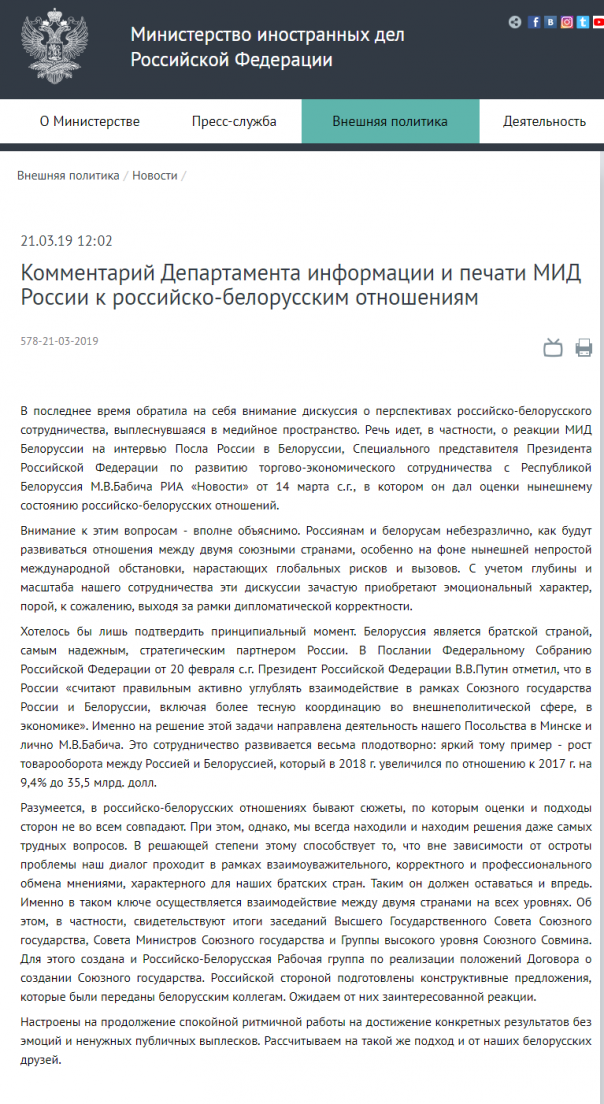 Хотелось бы лишь подтвердить принципиальный момент. Белоруссия является братской страной, самым надежным, стратегическим партнером России. В Послании Федеральному Собранию Российской Федерации от 20 февраля с.г. Президент Российской Федерации В.В.Путин отметил, что в России «считают правильным активно углублять взаимодействие в рамках Союзного государства России и Белоруссии, включая более тесную координацию во внешнеполитической сфере, в экономике». Именно на решение этой задачи направлена деятельность нашего Посольства в Минске и лично М.В.Бабича. Это сотрудничество развивается весьма плодотворно: яркий тому пример ‑ рост товарооборота между Россией и Белоруссией, который в 2018 г. увеличился по отношению к 2017 г. на 9,4% до 35,5 млрд. долл.