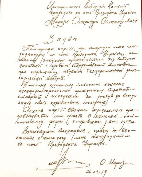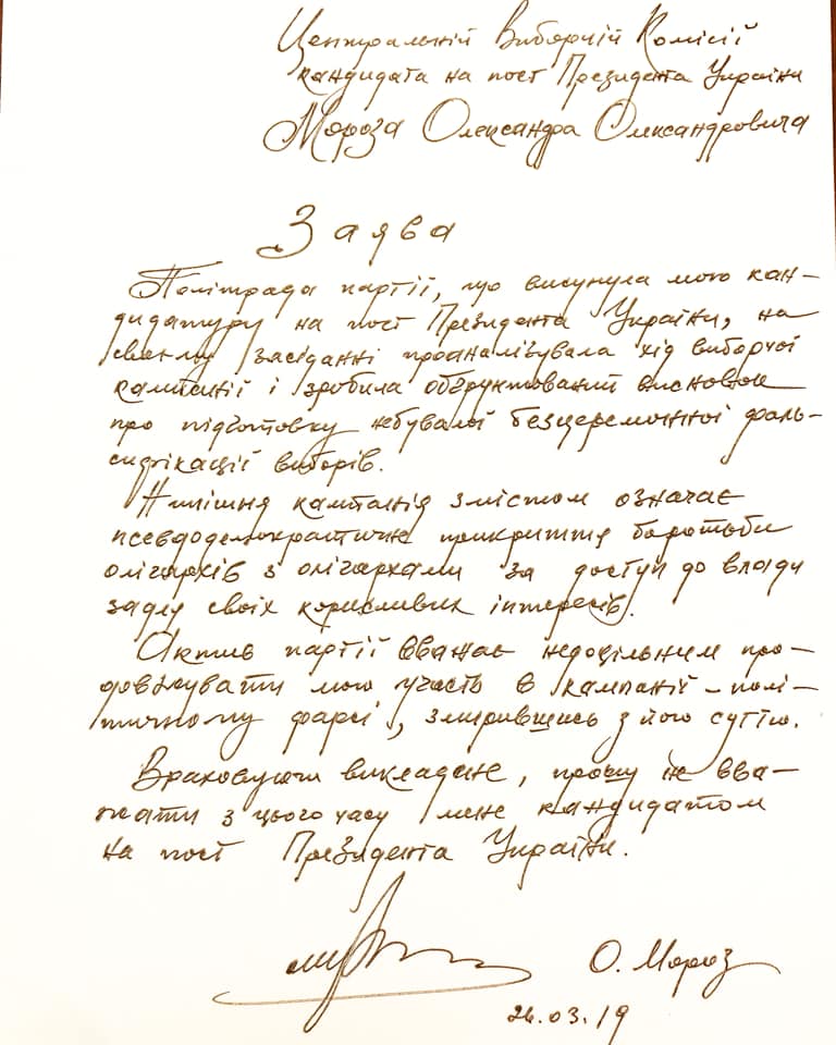 «Политсовет партии, выдвинувший мою кандидатуру на пост президента Украины, на своем заседании проанализировал ход избирательной кампании и сделал обоснованный вывод о подготовке небывалой бесцеремонной фальсификации выборов. Актив партии считает нецелесообразным продолжать мое участие в кампании — политическом фарсе, смирившись с его сутью», — сказано в заявлении, опубликованном на странице Мороза в Фейсбук.