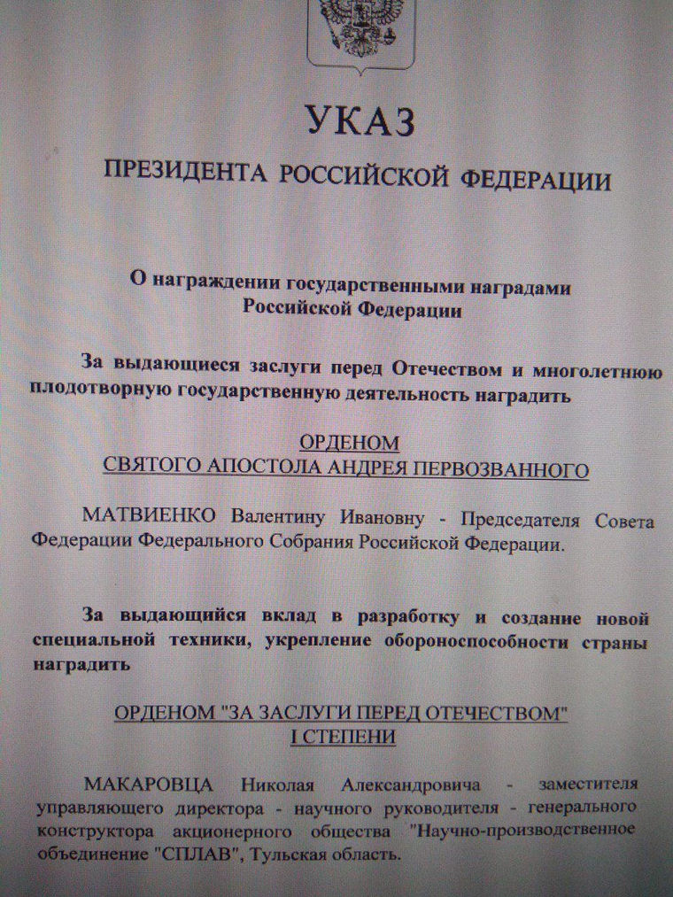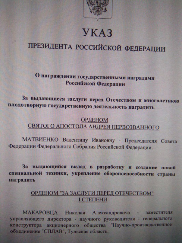 Орден Святого апостола Андрея Первозванного - высшая государственная награда Российской Федерации (до 1917 года - высшая награда Российской Империи). Он вручается за "исключительные заслуги, способствующие процветанию, величию и славе России". Среди кавалеров ордена мы видим Петра I, Елизавету Петровну, Екатерину II, Александра Суворова, Григория Потёмкина, Константина Победоносцева, Михаила Кутузова, Петра Румянцева-Задунайского, Матвея Платова, Алексея Ермолова, Петра Багратиона, Михаила Милорадовича, Фёдора Апраксина, Алексея Бестужева-Рюмина, Александра Горчакова, Бориса Шереметева, Михаила Барклая-де-Толли, Ивана Паскевича-Эриванского, Василия Долгорукова-Крымского, Константина фон Кауфмана, Александра Тормасова, Алексея Сенявина, Михаила Лазарева, Александра Бенкендорфа, Фёдора Ростопчина, Алексея Аракчеева, Сергея Уварова, Александра Барятинского, Фёдора Литке, Иосифа Гурко, Эдуарда Тотлебена, Александра Дондукова-Корсакова, Дмитрия Толстого, Сергея Урусова, Николая Игнатьева, Петра Семёнова-Тян-Шанского, митрополита Филарета (Дроздова), митрополита Серафима (Глаголевского), митрополита Иосифа (Семашко), митрополита Иннокентия (Вениаминова), митрополита Платона (Городецкого), митрополита Иоанникия (Руднева) и др. С момента восстановления ордена в 1998 году его кавалерами стали всего 18 человек. 7.10.1998 награждён выдающийся оружейник Михаил Калашников, 19.02.1999 - Патриарх Московский и всея Руси Алексий II. Единственный государственный деятель современной России, ставший кавалером ордена Святого апостола Андрея Первозванного до Матвиенко - министр обороны Сергей Шойгу. 9 мая 2014 года он появился с этой наградой на Параде Победы в Севастополе.