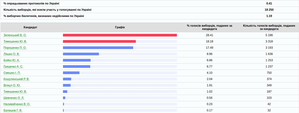 По обновленным данным Центральной избирательной комиссии лидируют кандидаты Владимир Зеленский и Юлия Тимошенко. Действующий президент Петр Порошенко на третьем месте.