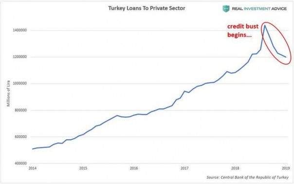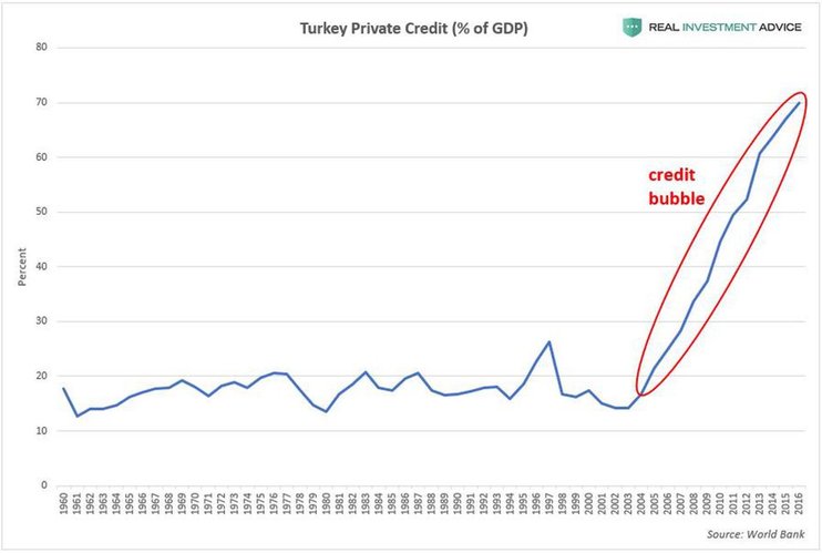 Однако в реальности начало этой ситуации было положено много лет назад, когда начал формироваться кредитный "пузырь". Когда центробанк Турция сохраняет процентные ставки на необычно низких уровнях в течение долгого времени, возникают опасные дисбалансы. И если рынки и экономика попытаются стабилизироваться, боли не избежать. К сожалению, кредитный кризис и рецессия в Турции находятся только на ранних стадиях.