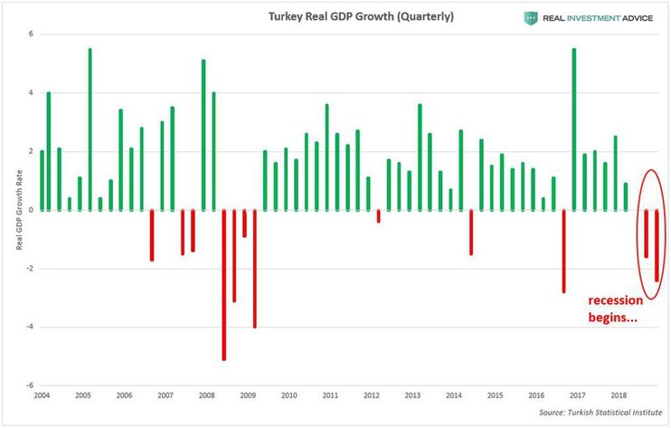 Что еще хуже, Турция находится в рецессии, после падения ВВП на 2,4% в IV квартале 2018 г. и на 1,6% в III квартале:
