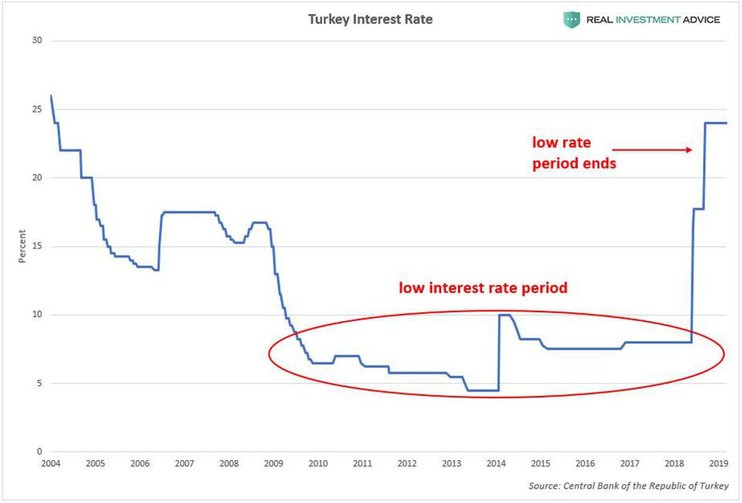 С 2009 по 2018 гг. процентные ставки в Турции оставались на рекордно низком уровне. Это привело к чрезмерному росту кредитного "пузыря" в стране. Эпоха низких процентных ставок в Турции закончилась в 2018 г., когда центробанк поднял ставки с 8% до 24%. Как правило, быстрое повышение процентных ставок заканчивается взрывом кредитных "пузырей", кредитными спадами и рецессией.