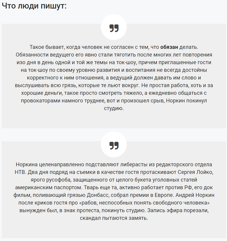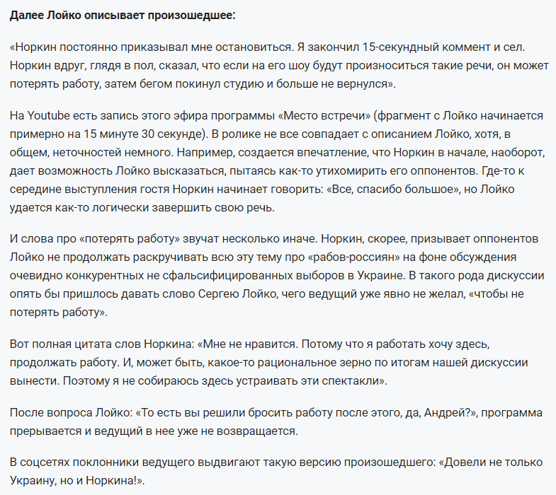 Лойко заявил, что Норкин не раз его перебивал и просил прекратить выступление, после чего заявил, что из-за подобных речей может лишиться работы и ушел из студии. При этом Стоит отметить, что Норкин также не вышел в вечерний эфир в ток-шоу "Изменить нельзя", ведущим которой также является. Источник