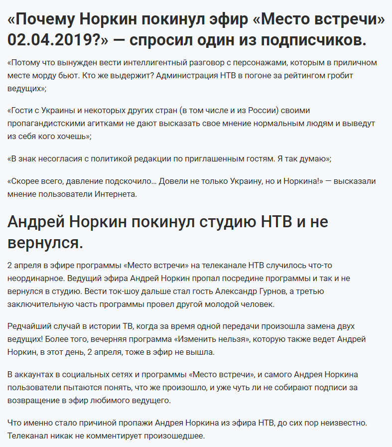 Телеведущий политического ток-шоу "Место встречи" на НТВ Андрей Норкин покинул студию посреди эфира и с тех пор больше не появлялся в программах телеканала, несмотря на то, что также является ведущим передачи "Изменить нельзя".