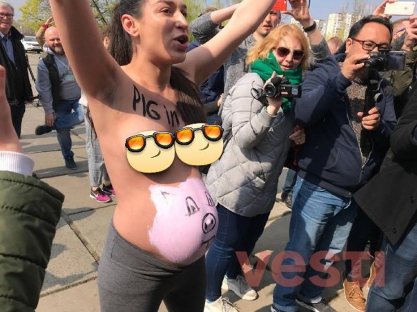 Акцию протеста устроила обнаженная беременная девушка. Она кричала: «Хватит насиловать страну!», а на животе у нее была нарисована морда свиньи.