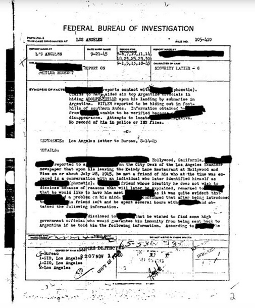 Судя по документам, ФБР рассматривало версию о побеге фюрера в Аргентину после падения Берлина в 1945 году. Такая информация поступила в главный офис ведомства в 1945 году.