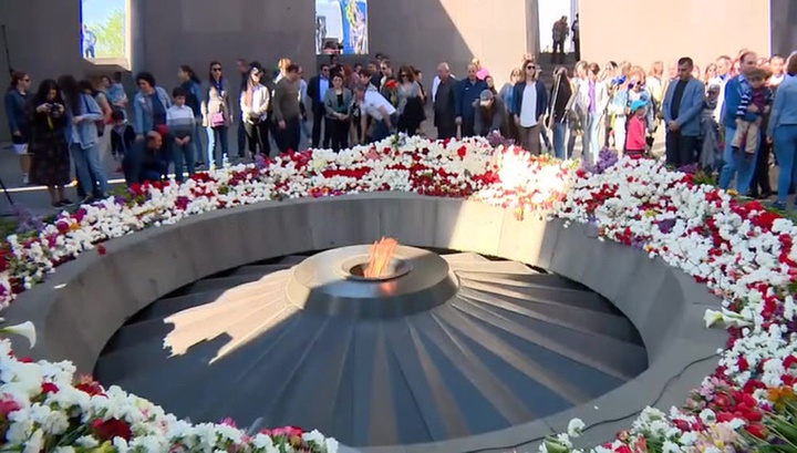 В Армении чтят память жертв геноцида 1915 года. На территории всей республики приспущены государственные флаги, закрыты кафе и рестораны. В Ереване уже с утра к мемориальному комплексу пришли тысячи людей, в том числе политическое и духовное руководство страны, представители дипломатического корпуса, чтобы возложить цветы к вечному огню, передает телеканал "Россия 24".
