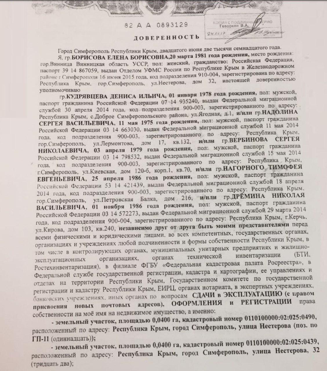 «Это вытекает из доверенности на оформление недвижимости, которую выдала в Крыму жена фигуранта – Елена Борисова. Сделала она это по российским законам, признавая таким образом и легализовывая в Крыму российскую власть. Российскому нотариусу жена украинского патриота представила паспорт, выданный ФМС России 16 июня 2015 года, то есть в самый разгар угроз Яценюка и Бурбака привлечь к ответственности всех, кто сотрудничает в Крыму с оккупационным российским режимом. Кроме того, теща Бурбака – Ольга Борисова, в феврале 2015 оформила на себя по российским законам торговый центр в Ялте, указав в регистрационных документах такие слова: «субъект Российской Федерации Республика Крым», – пишет Портнов.