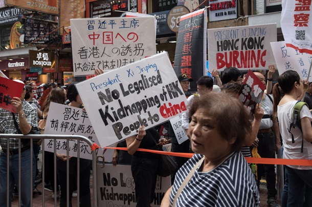 "Председатель Си Цзиньпин, нет легализованному похищению граждан Гонконга в Китай", − было написано на одном плакате.