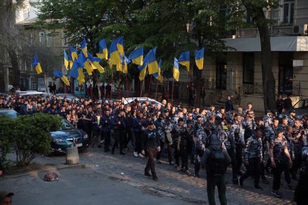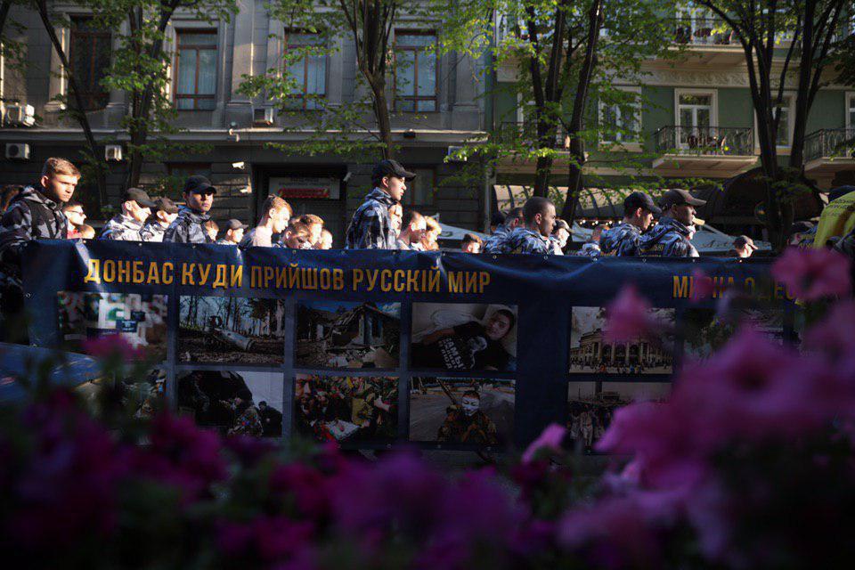 Немногочисленная колонна националистов несла плакаты с фотографиями разрушений, снарядов и жертв, подписанных «Русский мир» и изображениями мирной Одессы как намёк на украинскую альтернативу. Радикалы выкркивали: «Слава Украине –героям слава!», «Слава героям 2 мая», «Коммуняку на гиляку», «Вильная Одесса – вильна Украина», «Героям 2 мая трижды ура», «2 мая – день победы».