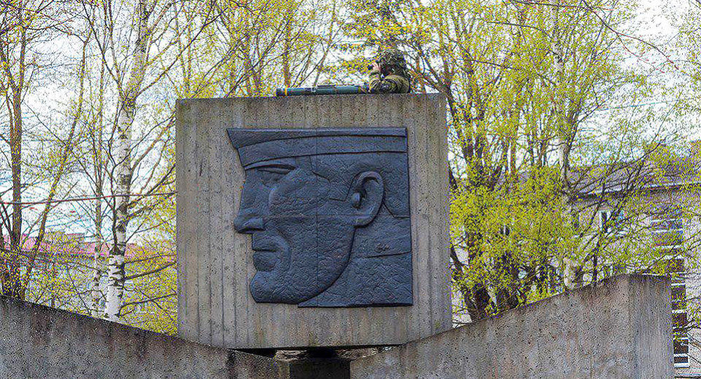 В городе Силламяэ в Эстонии есть памятник воинам, павшим в Великую Отечественную войну. В ходе учений НАТО "Весенний шторм-2019" какому-то вояке пришло в голову залезть на памятник с гранатометом.