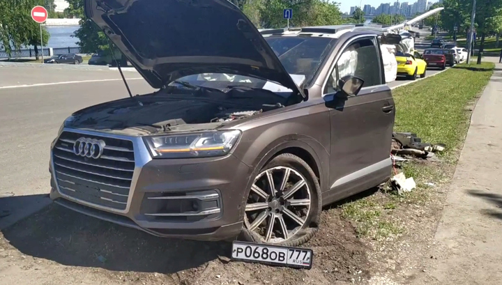 ДТП произошло ранним утром 17 мая на Нагатинской набережной. На кадрах видны вырванный из земли столб и разорванный на две части кроссовер, у которого продолжают работать аварийные сигналы.