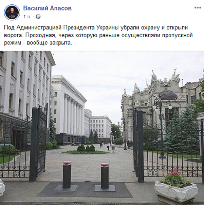 «Под Администрацией президента Украины убрали охрану и открыли ворота. Проходная, через которую раньше осуществляли пропускной режим — вообще закрыта», — написал он.