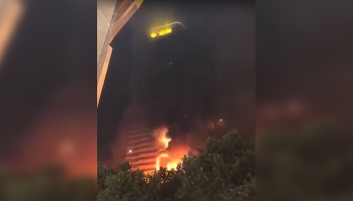 Пожарные предполагают, что возгорание началось из-за неисправной проводки в отеле "Золотой Орел", расположенном на девятом этаже, после чего пламя перекинулось наружу.