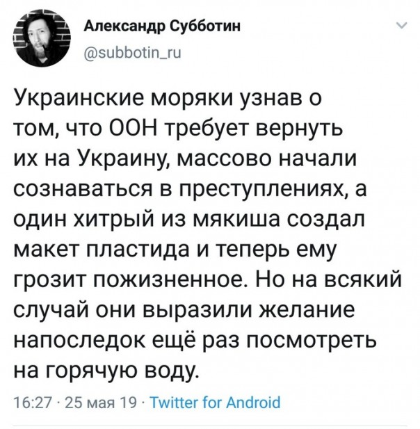 «Решение Международного суда ООН по морскому праву об освобождении наших моряков и судов требует мировой реакции... Обращаюсь к президенту Зеленскому — требуйте немедленного созыва Совета Безопасности ООН и реакции членов «группы семи» и ЕС», — написал он.